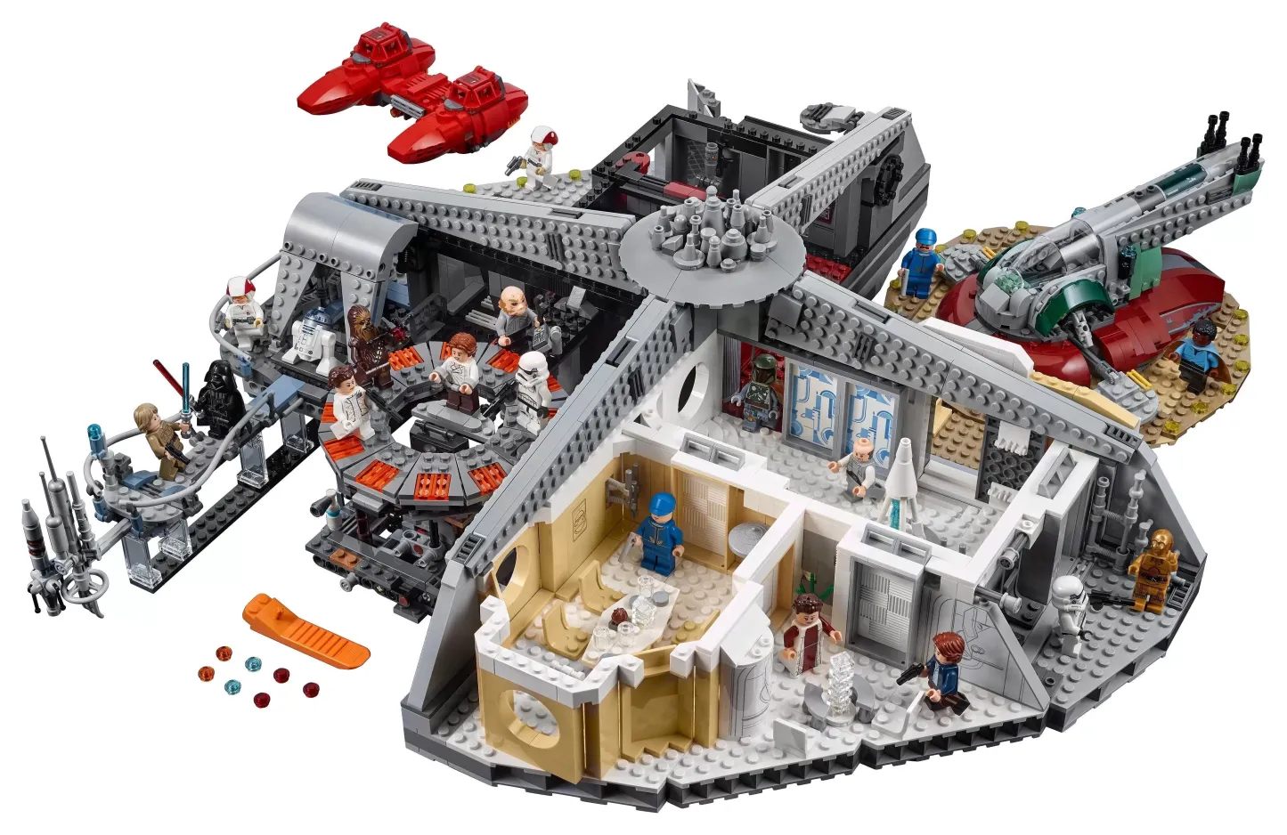 Includes 18 minifigures: Han Solo, Princess Leia and Luke Skywalker in Bespin outfits, Chewbacca, C-3PO, Lando Calrissian, Lobot, 2 Cloud City Guards, 2 Cloud Car Pilots, Leia and Han in Hoth outfits, Darth Vader, Boba Fett, 2 Stormtroopers and an Ugnaught, plus R2-D2 and an IG-88 droid.
