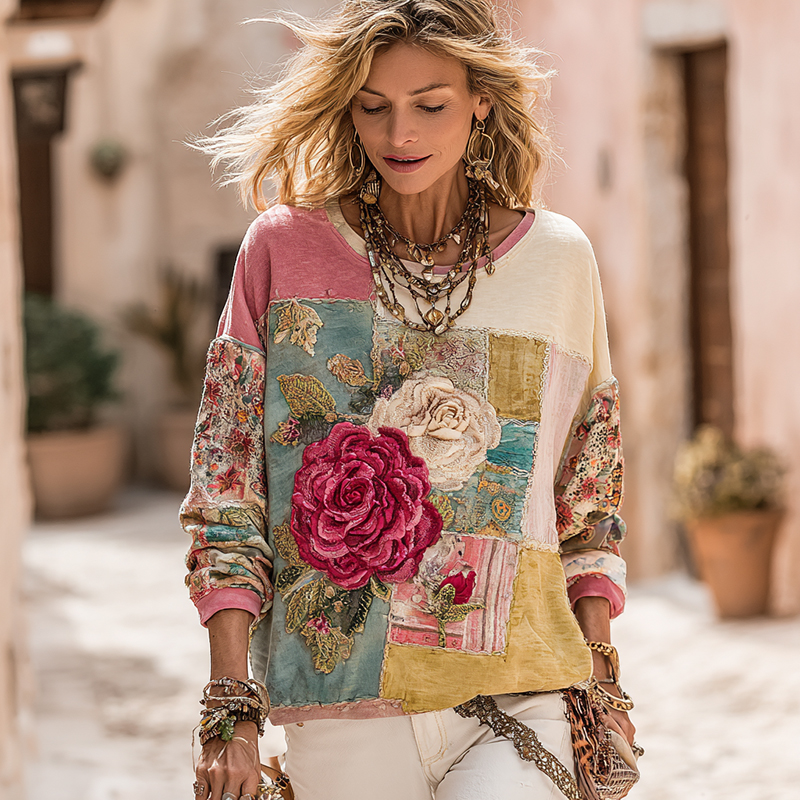 Women's Vintage Rose Floral Patchwork Crew Neck Casual Sweatshirt