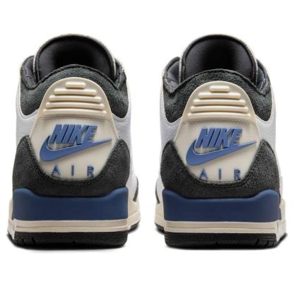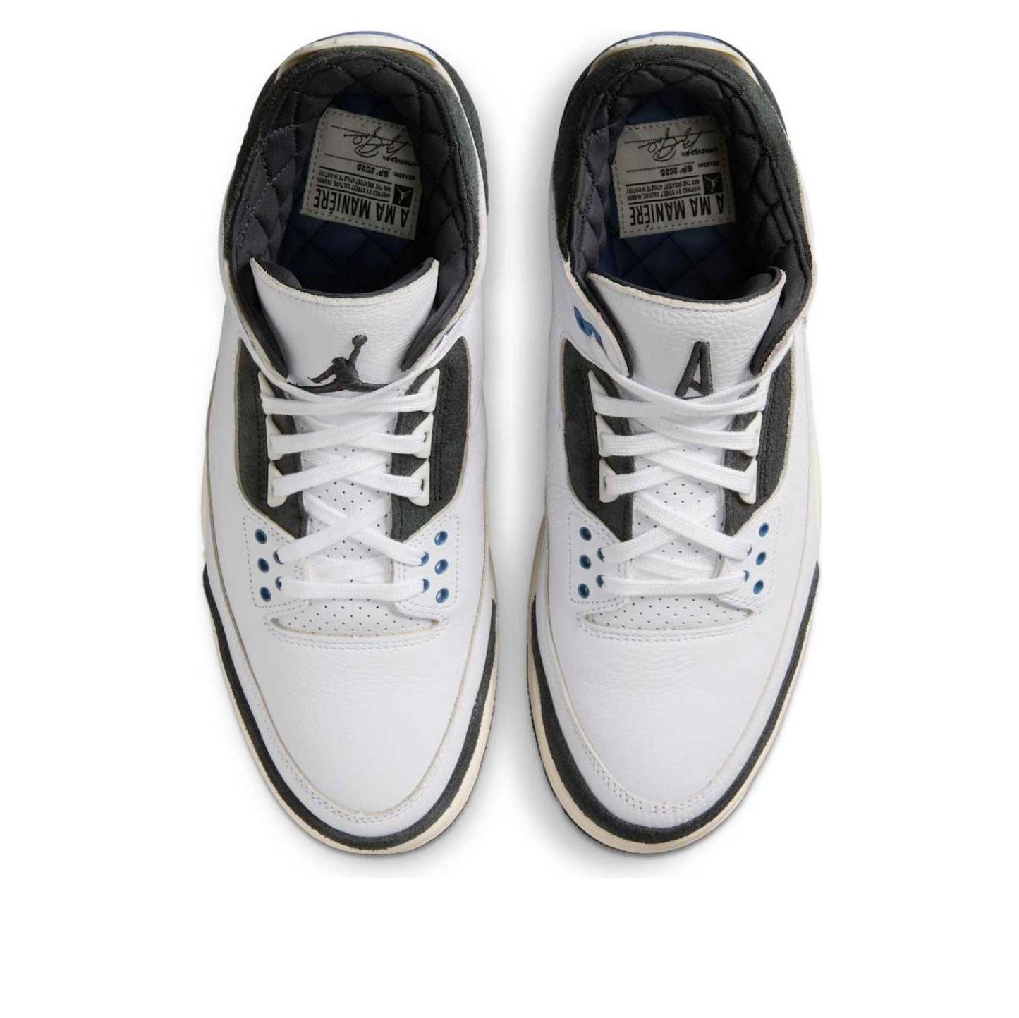A Ma Manière's Spring 2025 Air Jordan 3 "Diffused Blue" elevates the classic silhouette. Premium suede replaces elephant print, while diffused blue accents and subtle branding add a sophisticated touch. Meaningful heel tab messaging ("All We Have Is Each Other" and "You Need To Get Comfortable Walking Alone") completes this refined collaboration.