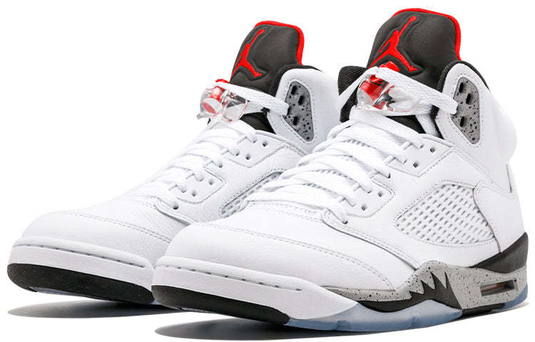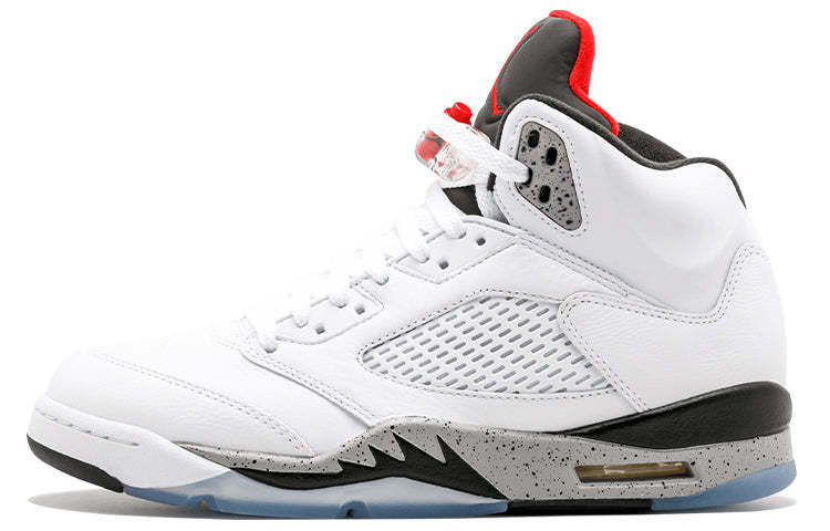 The Nike Air Jordan 5 Retro 'White Cement' is a sneaker that exudes style and class. Featuring a white leather upper with speckled Cement Grey accents at the midsole and upper eyelets, this sneaker is perfect for those who want to make a statement. The translucent ice-blue outsole and 3M reflective black tongue add an extra level of detail to this already attention-grabbing sneaker. University Red Jumpman branding on the tongue completes the look of this stylish sneaker. Whether you're hitting the basketball court or just strolling down the street, the Nike Air Jordan 5 Retro 'White Cement' is a sneaker that will have you looking your best.