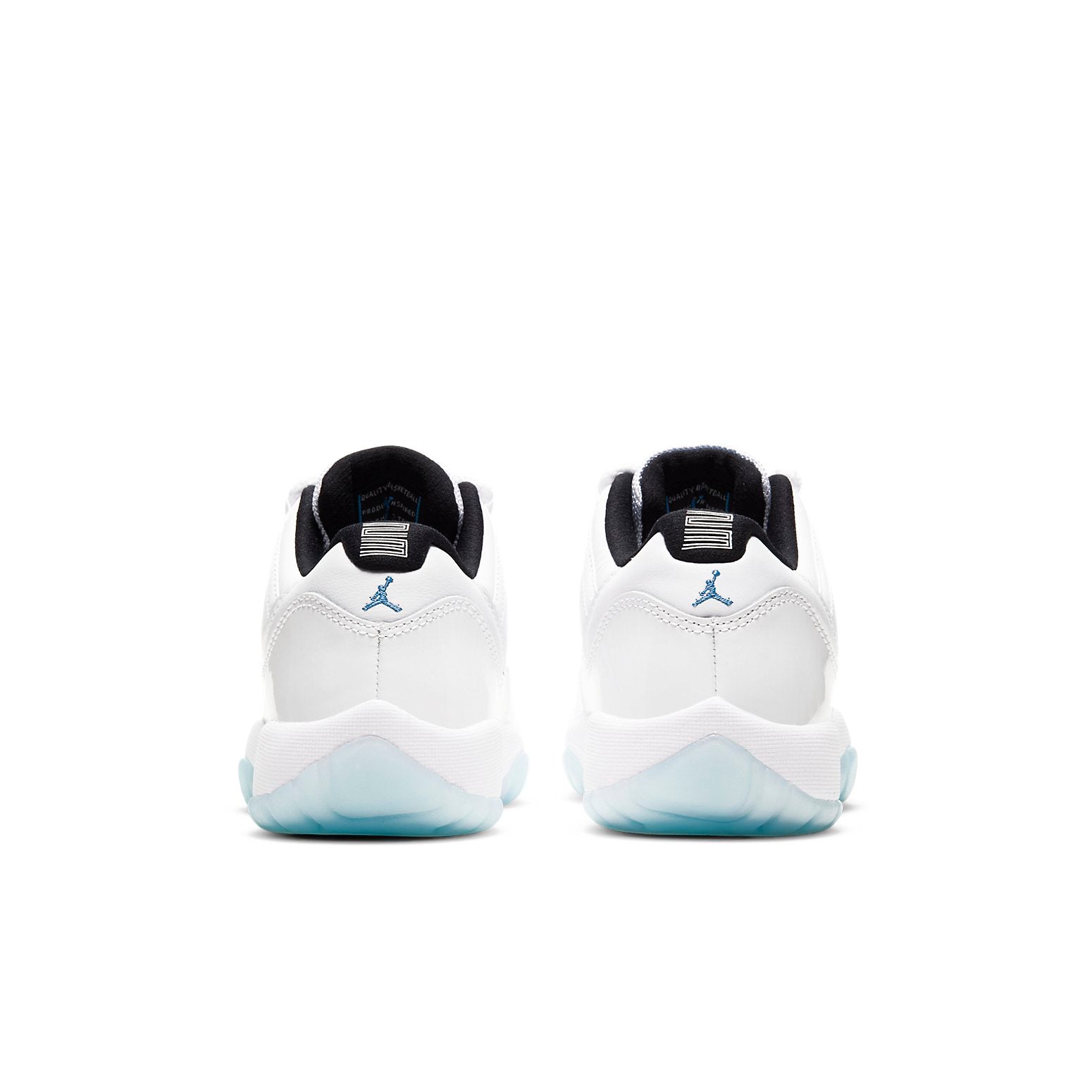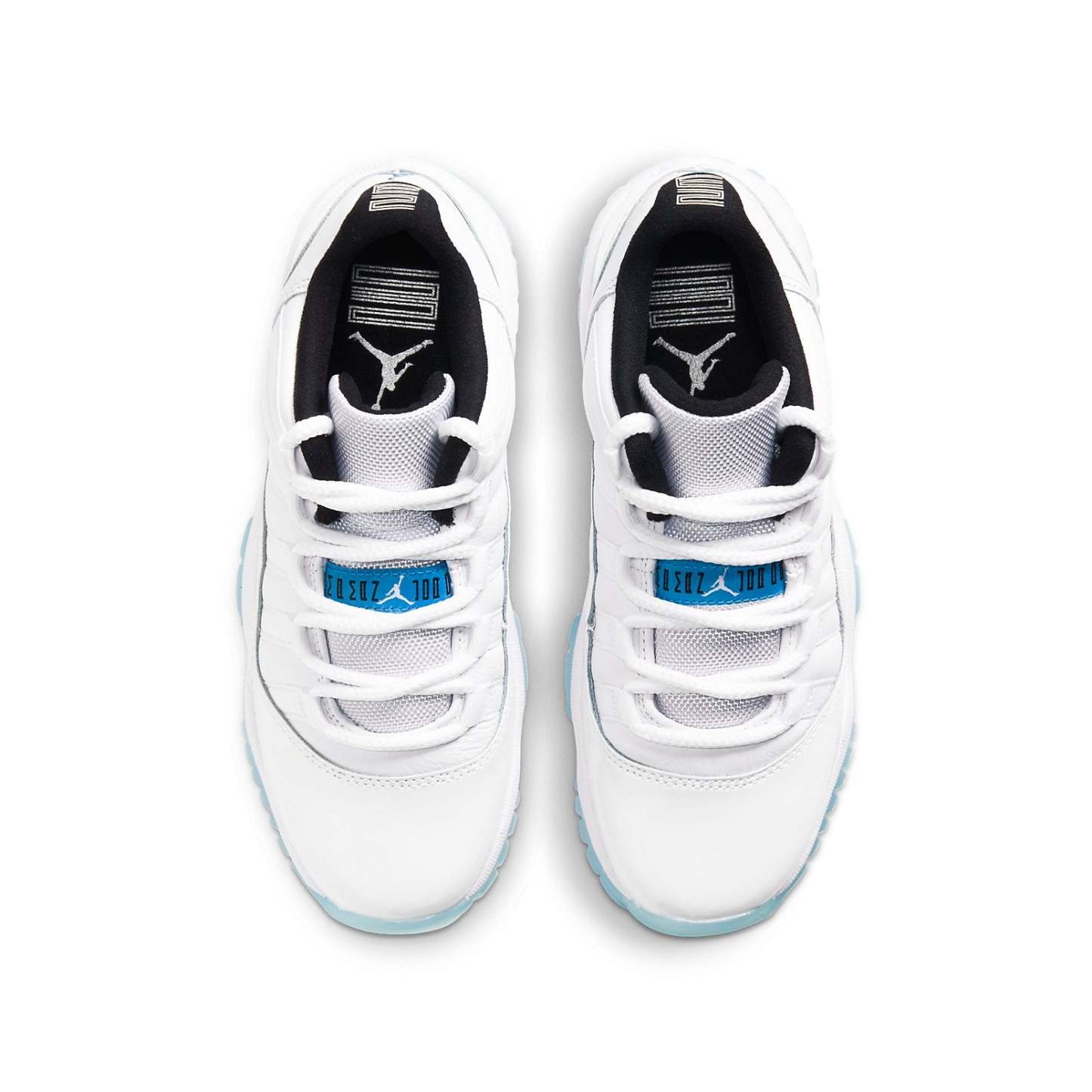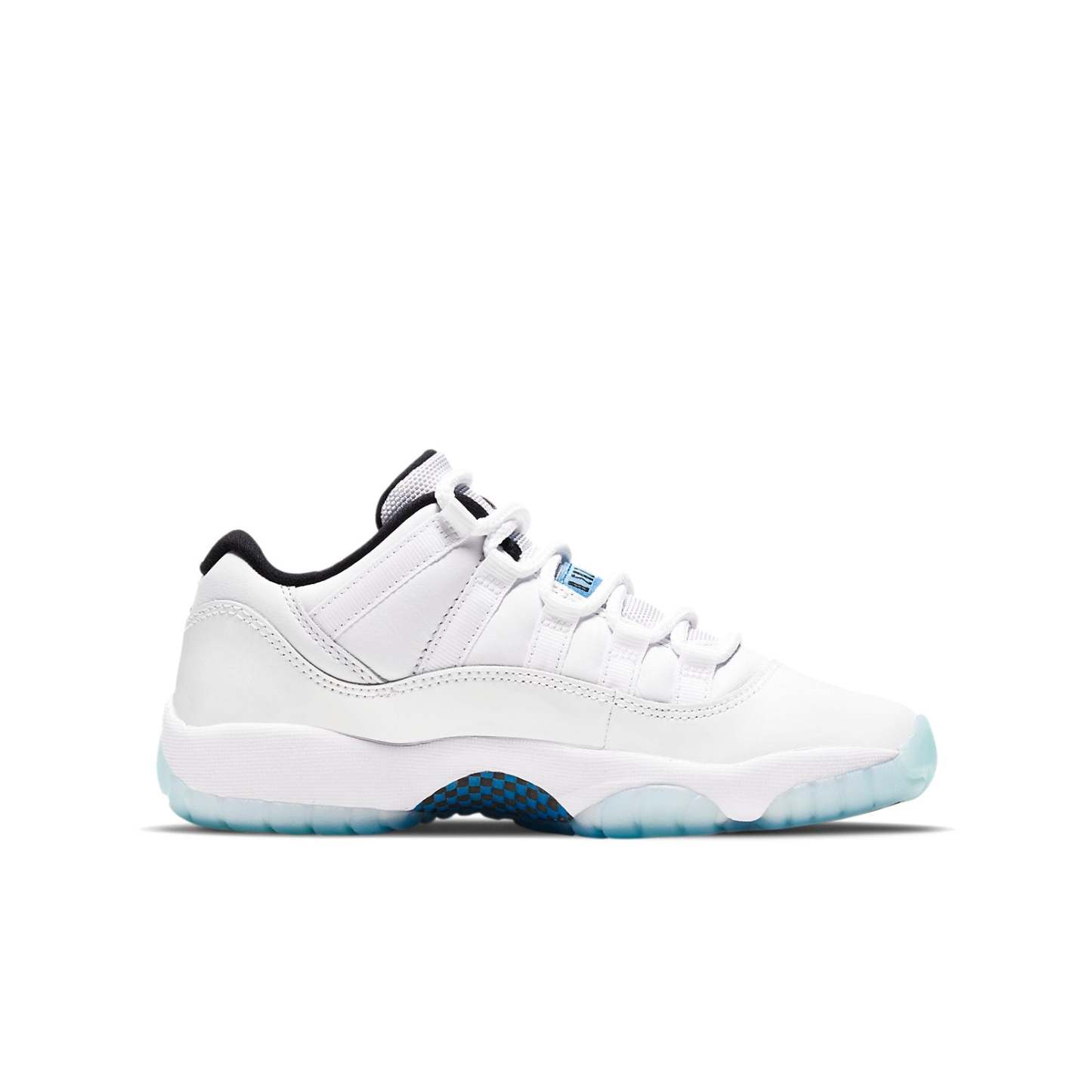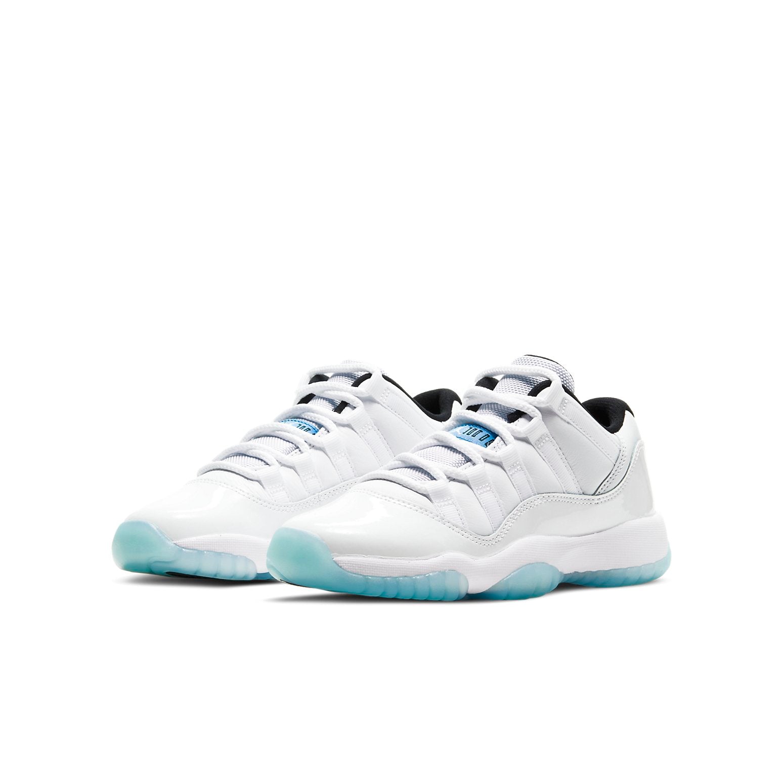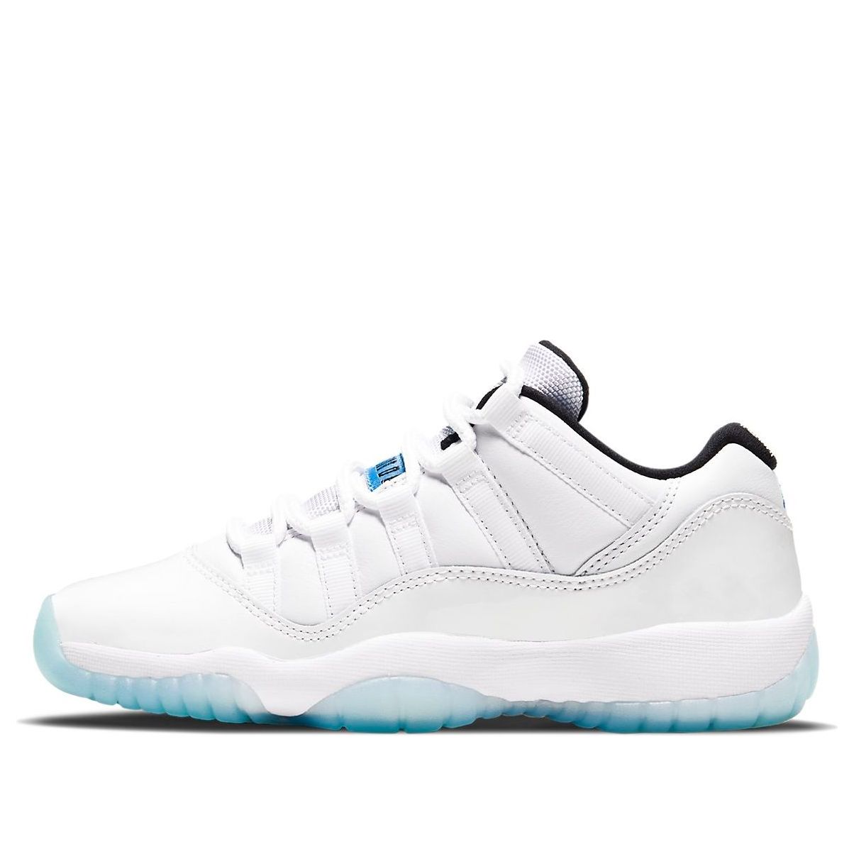 The Air Jordan 11 Retro Low GS 'Legend Blue' takes design cues from the original Air Jordan 11 that Michael Jordan debuted at the 1996 NBA All-Star Game. This shoe features a white leather upper with a tonal patent leather mudguard and breathable mesh tongue. Carolina blue accents appear on the tongue and heel, with the latter featuring an embroidered Jumpman. A Phylon midsole provides lightweight cushioning, while an icy translucent outsole completes the look.