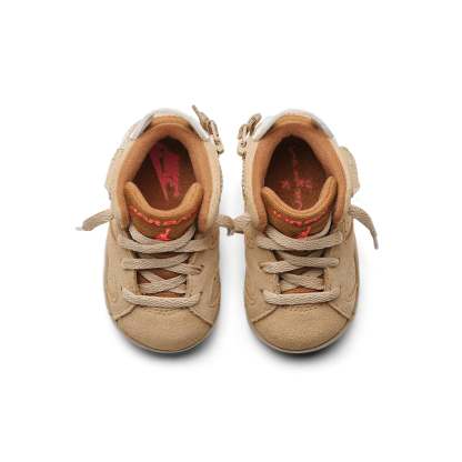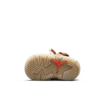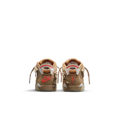 The Nike TDTravis Scott x Air Jordan 6 Retro British Khaki is a scaled-down version of the highly coveted collaboration between Travis Scott and Air Jordan. This mid-top sneaker is outfitted in a tan suede upper, with stash pouches on either side of the collar paying homage to Scott's "Cactus Jack" nickname. The bright crimson accents on the Jumpman branding on the tongue and the mismatched Nike and Cactus Jack logos on each heel are a nice touch. The soft foam midsole provides ample cushioning, while the glow-in-the-dark rubber outsole adds a bit of fun and functionality.